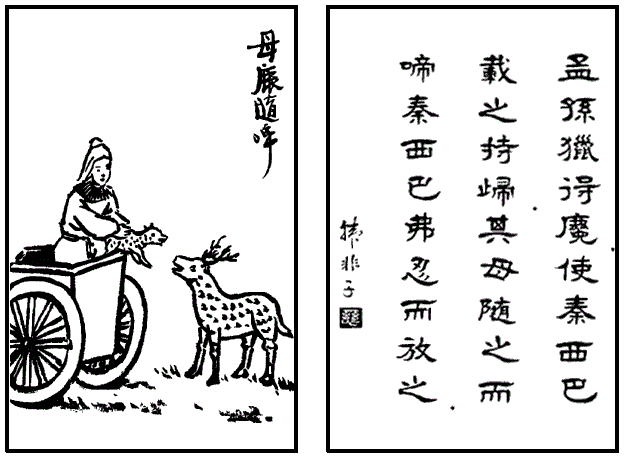 孟孙氏打猎得到一只幼鹿,派秦西巴拿回去烧煮它。母鹿跟随着秦西巴并啼叫。秦西巴不忍心,(将幼鹿)放还给母鹿。孟孙氏回来后,寻找鹿在哪里。秦西巴回答说:“小鹿的妈妈跟在后面啼叫,我实在不忍心,私自放还给母鹿。”孟孙氏很生气,把秦西巴赶走了。过了一年,又采用他把他作为儿子的老师。左右大臣和侍卫说:“秦西巴对您有罪,现在却把他作为您儿子的老师,为什么?”孟孙氏说:“(他)对一只小鹿都不忍心伤害,又何况对人呢?”