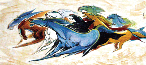 可爱的九匹马神姿争俊竞雄,昂首阔视显得高雅深沉稳重。