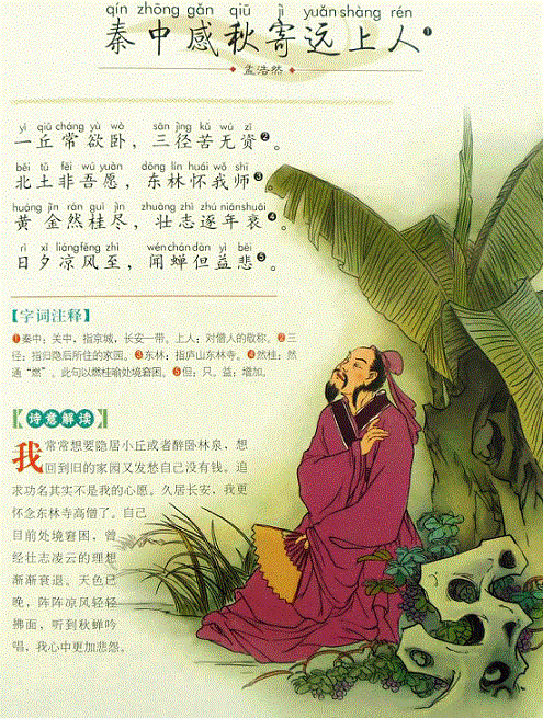 日夕凉风至,闻蝉但益悲。出自唐代诗人孟浩然作品《秦中感秋寄远上人》。首联诉说自己隐居的愿望和无力隐居的苦衷;颔联写自己北上求仕的违背心愿的羡慕跳出尘世的远上人;颈联写困居长安的境况,雄心壮志逐年衰减;尾联描写黄昏、秋风、鸣蝉,一派萧瑟景象,突出了客中的抑郁心情。全诗反映了作者当时困苦的境地和对仕途的失望,寄赠是表,抒发不遇之感是实。这首诗直抒胸臆,如画中白描,不加润色,直写心中的哀愁苦闷,感情真挚自然。