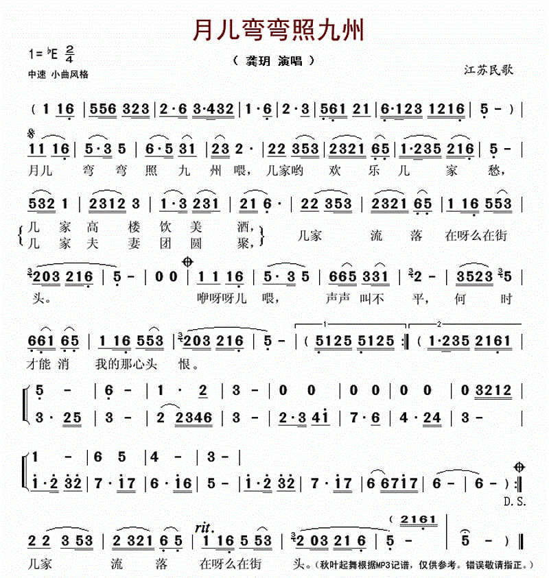 作品简介《月儿弯弯照九州》是自南宋以来流行于江苏省一带的地方民歌。该民歌出自南宋建炎年间(1127~1130),述民间离乱之苦。明末冯梦龙所编《山歌》中也有记录。