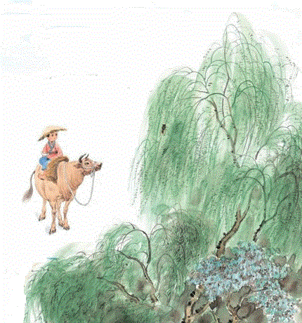 牧童骑在黄牛背上,嘹亮的歌声在林中回荡。忽然想要捕捉树上鸣叫的知了,就马上停止唱歌,一声不响地站立在树旁。