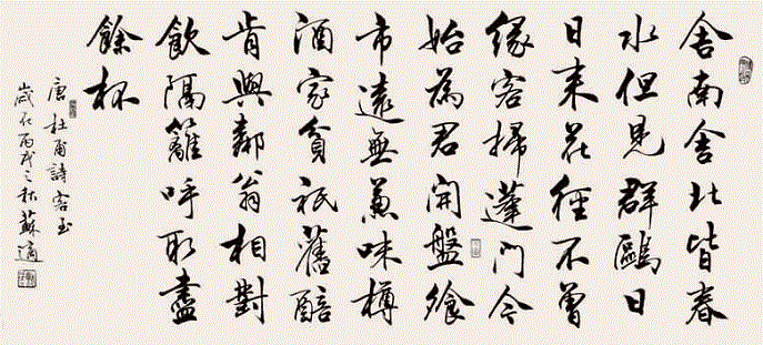 首联先从户外的景色着笔,点明客人来访的时间、地点和来访前夕作者的心境。“舍南舍北皆春水”,把绿水缭绕、春意荡漾的环境表现得十分秀丽可爱。这就是临江近水的成都草堂。“皆”字暗示出春江水势涨溢的情景,给人以江波浩渺、茫茫一片之感。群鸥,在古人笔下常常作水边隐士的伴侣,它们“日日”到来,点出环境清幽僻静,为作者的生活增添了隐逸的色彩。“但见”,含弦外之音:群鸥固然可爱,而不见其他的来访者,也是过于单调。作者就这样寓情于景,表现了他在闲逸的江村中的寂寞心情。这就为贯串全诗的喜客心情,巧妙地作了铺垫。