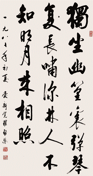 这首诗表现了一种清静安详的境界。前两句写诗人独自一人坐在幽深茂密的竹林之中,一边弹着琴弦,一边又发出长长的啸声。其实,不论“弹琴”还是“长啸”,都体现出诗人高雅闲淡、超拔脱俗的气质,而这却是不容易引起别人共鸣的。所以后两句说:“深林人不知,明月来相照。”意思是说,自己僻居深林之中,也并不为此感到孤独,因为那一轮皎洁的月亮还在时时照耀自己。这里使用了拟人化的手法,把倾洒着银辉的一轮明月当成心心相印的知己朋友,显示出诗人新颖而独到的想象力。全诗的格调幽静闲远,仿佛诗人的心境与自然的景致全部融为一体了。