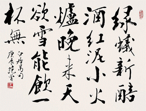 其次是色彩的合理搭配。诗画相通贵在情意相契,诗人虽然不能像雕塑家、画家那样直观地再现色彩,但是可以通过富有创意的语言运用,唤起读者相应的联想和情绪体验。这首小诗在色彩的配置上是很有特色的,清新朴实,温热明丽,给读者一种身临其境、悦目怡神之感。诗歌首句“绿蚁”二字绘酒色摹酒状,酒色流香,令人啧啧称美,酒态活现让读者心向“目”往。次句中的“红”字犹如冬天里的一把火,温暖了人的身子,也温热了人的心窝。“火”字表现出炭火熊熊、光影跃动的情境,更是能够给寒冬里的人增加无限的热量。“红”“绿”相映,色味兼香,气氛热烈,情调欢快。第三句中不用摹色词语,但“晚”“雪”两字告诉读者黑色的夜幕已经降落,而纷纷扬扬的白雪即将到来。在风雪黑夜的无边背景下,小屋内的“绿”酒“红”炉和谐配置,异常醒目,也格外温暖。