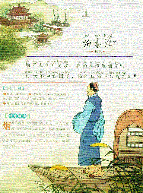 六朝古都金陵的秦淮河两岸历来是达官贵人们享乐游宴的场所,“秦淮”也逐渐成为奢靡生活的代称。诗人夜泊于此,眼见灯红酒绿,耳闻淫歌艳曲,触景生情,又想到唐朝国势日衰,当权者昏庸荒淫,便感慨万千,写下了这首《泊秦淮》。