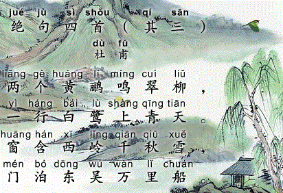 黄鹂在新绿的柳条间叫着春天,成双作对好喜庆;白鹭排成行迎着春风飞上青天,队列整齐真优美。那西岭的雪峰啊,像一幅美丽的画嵌在窗框里;这门前的航船啊,竟是从万里之外的东吴而来。