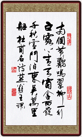 苏轼曾经说过:“少陵翰墨无形画”。此诗就像一幅绚丽生动的山水条幅:黄鹂、翠柳、白鹭、青天、江水、雪山,色调淡雅和谐,图象有动有静。画的中心是几棵翠绿的垂柳,黄莺儿在枝头婉转歌唱;画的上半部是青湛湛的天,一行白鹭映于碧空;远处高山明灭可睹,遥望峰巅犹是经年不化的积雪;近处露出半边茅屋,门前一条大河,水面停泊着远方来的船只。从颜色和线条看,作者把两笔鹅黄点染在一片翠绿之中,在青淡的空间斜勾出一条白线。点线面有机结合,色彩鲜明而又和谐。诗人身在草堂,思接千载,视通万里,胸次开阔,出语雄健。全诗对仗精工,着色鲜丽,动静结合,声形兼俱,每句诗都是一幅画,又宛然组成一幅咫尺万里的壮阔山水画卷。