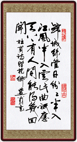 说是语含讽刺,耐人寻味的是,作者并没有对花卿明言指摘,而是采取了一语双关的巧妙手法。字面上看,这俨然是一首十分出色的乐曲赞美诗。“锦城丝管日纷纷”,锦城,即成都;丝管,指弦乐器和管乐器;纷纷,本意是既多而乱的样子,通常是用来形容那些看得见、摸得着的具体事物的,这里却用来比状看不见、摸不着的抽象的乐曲,这就从人的听觉和视觉的通感上,化无形为有形,极其准确、形象地描绘出弦管那种轻悠、柔靡,杂错而又和谐的音乐效果。“半入江风半入云”也是采用同样的写法:那悠扬动听的乐曲,从花卿家的宴席上飞出,随风荡漾在锦江上,冉冉飘入蓝天白云间。这两句诗,使读者真切地感受到了乐曲的那种“行云流水”般的美妙。两个“半”字空灵活脱,给全诗增添了不少的情趣。