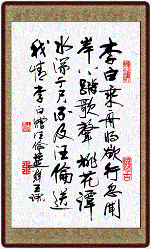 李白要走的那天,汪伦送给李白名马八匹、绸缎十捆,派仆人给他送到船上。在家中设宴送别之后,李白登上了停在桃花潭上的小船,船正要离岸,忽然听到一阵歌声。李白回头一看,只见汪伦和许多村民一起在岸上踏步唱歌为自己送行。主人的深情厚谊,古朴的送客形式,使李白十分感动。他立即铺纸研墨,写下此诗给汪伦。