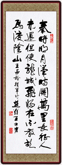 “但使龙城飞将在,不教胡马度阴山”两句,融抒情与议论为一体,直接杆发戍边战士巩固边防的愿望和保卫国家的壮志,洋溢着爱国激情和民族自豪感。写得气势豪迈,铿锵有力。同时,这两句又语带讽刺,表现了诗人对朝廷用人不当和将帅腐败无能的不满。有弦外之音,使人寻味无穷。