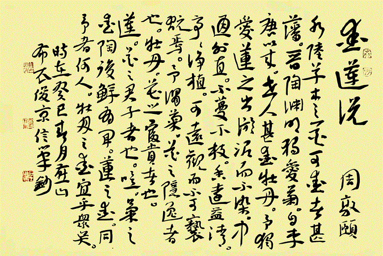 作者起笔说:“水陆草木之花,可爱者甚蕃。”选用“可爱”二字,包罗群芳,表明托物寄兴,并不刻意求工,极见其立言斟酌之妙。接着叙说“晋陶渊明独爱菊”。陶渊明不肯为五斗米折腰,解绶归隐后,饮酒赋诗,安享“采菊东篱下,悠然见南山”的田园逸趣。“独爱菊”,显示渊明雅致芬芳,傲然物外的性格,而且更加明确了题意:陶渊明可以爱菊抒怀,我怎不可独爱莲呢?继写“自李唐来,世人甚爱牡丹”,写了唐人,特别是统治阶层“甚爱牡丹”的好尚,这几句像是重复,但实为加深语意也,而且此句入文,让对比感更为强烈,为其求莲之高洁铺下了引子。大意是周敦颐本人独爱莲与晋陶渊明的爱菊避世不同,为保持一份高洁,宁愿终老南山。他要在尘世中当个出淤泥而不染的君子。这种在污世保持清白与独自避世求真的心态,与众人皆羡富贵(牡丹)的从众心态是有着思想境界上本质的区别的。这为爱莲说所要表达的“出淤泥而不染”作了最好的铺垫。然后作者撇开一笔说,让那班人爱其所爱吧,“予独爱莲之出淤泥而不染,濯清涟而不妖,中通外直,不蔓不枝,香远益清,亭亭净植,可远观而不可亵玩焉”。这一连串铺叙,对莲花挺拔秀丽的芳姿,清逸超群的令德,特别是可敬而不可侮慢的嵚崎磊落的风范,作了有力的渲染。这几句隐喻作者本身具有“出淤泥而不染,濯清莲而不妖”的高尚品格。实际上,他说的意思就是:官场黑暗,要在官场上保持自己高洁的品格,就如同莲花出淤泥而不染那么难。这也是他为官的经验总结,因为他不想同流合污。而“濯清莲而不妖”,不过是作者的一种良好愿望罢了。他为官正直,数洗冤狱,为民作主;晚年定居庐山,著书明道,洁身自爱,颐养天年,便是身体力行,澹泊明志的体现。这正是这篇小品能给人思想情趣以深切感染的着力之处。
