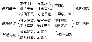 写两军交战的实况。这一部分作者笔墨不多,但是鲁军如何进攻、追击,齐军如何败绩、溃逃的情形历历在目。曹刿适时选择出击、追击的时机,他采取了后发制敌、以智取胜的战术。当齐军未动鲁庄公急于抢先攻击时,曹刿制止道:“未可。”直至齐军三鼓之后,军士勇气衰竭,他才表示:“可矣。”鲁军一鼓作气挫败了齐军。在追击的问题上,曹刿确察虚实而后动,制止了庄公的鲁莽,待下车察看齐军车辙的轨迹、登轼瞭望齐军麾帜旌旗之后,才果断地表示:“可矣。”此战鲁军大获全胜。