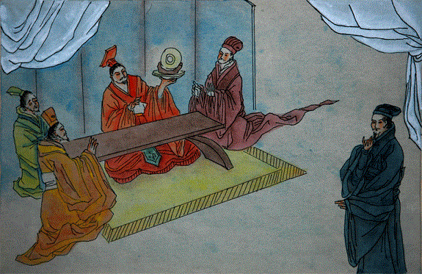 50.设九宾:一种外交上最隆重的仪式。有傧相九人依次传呼接引宾客上殿。宾,同“傧”。