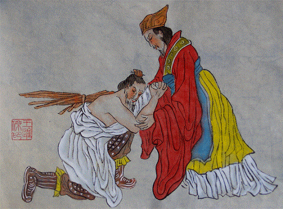 既罢归国,以相如功大,拜为上卿,位在廉颇之右(84)。廉颇曰:“我为赵将,有攻城野战之大功,而蔺相如徒以口舌为劳,而位居我上,且相如素贱人(85),吾羞,不忍为之下。”宣言曰:“我见相如,必辱之。”相如闻,不肯与会。相如每朝时,常称病,不欲与廉颇争列(86)。已而相如出,望见廉颇,相如引车避匿(87)。于是舍人(88)相与(89)谏曰:“臣所以去亲戚而事君者,徒慕君之高义也。今君与廉颇同列,廉君宣恶言而君畏匿之,恐惧殊甚,且庸人尚羞之,况于将相乎!臣等不肖,请辞去。”蔺相如固止之,曰:“公之视廉将军孰与秦王(90)?”曰:“不若也。”相如曰:“夫以秦王之威,而相如廷叱之,辱其群臣,相如虽驽(91),独畏廉将军哉?顾吾念之,强秦之所以不敢加兵于赵者,徒以吾两人在也。今两虎共斗,其势不俱生。吾所以为此者,以先国家之急而后私仇也。”廉颇闻之,肉袒负荆(92),因(93)宾客至蔺相如门谢罪。曰:“鄙贱之人,不知将军(94)宽之至此也。”卒相与欢,为刎颈之交(95)。————(节选)